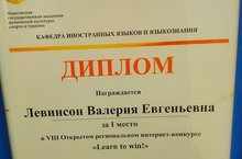 Левинсон Валерия ,ученица11Б класс награждена дипломом за1 место в интрнет-конкурсе "Учись побеждать".Поздравляем!