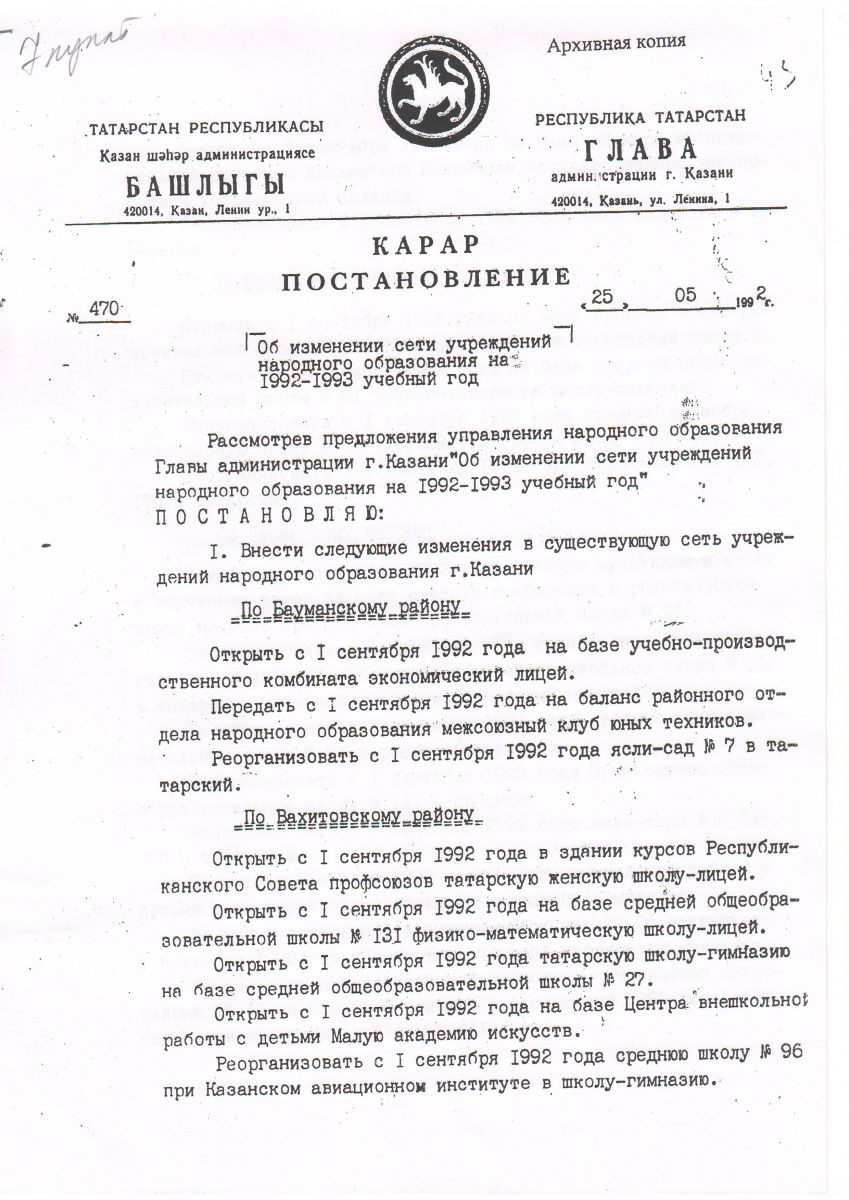 Решение Исполкома Казанского городского совета о создании школы