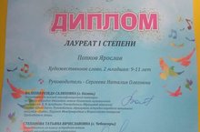 Ученик 4В класса нашей школы Попков Я. стал лауреатом I степени во II Всероссийском фестиваль-конкурсе детского, юношеского и взрослого творчества "Взлет" в номинации "Художетсвенное слово".
