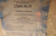 Славчева А. ученица 5б класса лауреат I степени во Всероссийском фестивале-конкурсе "Яблонь белый цвет" в номинации "Эстрадный вокал-соло"