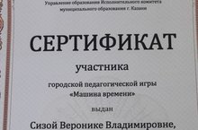 Сертификат Сизой В.В. за участие в городской педагогической игре "Машина времени"