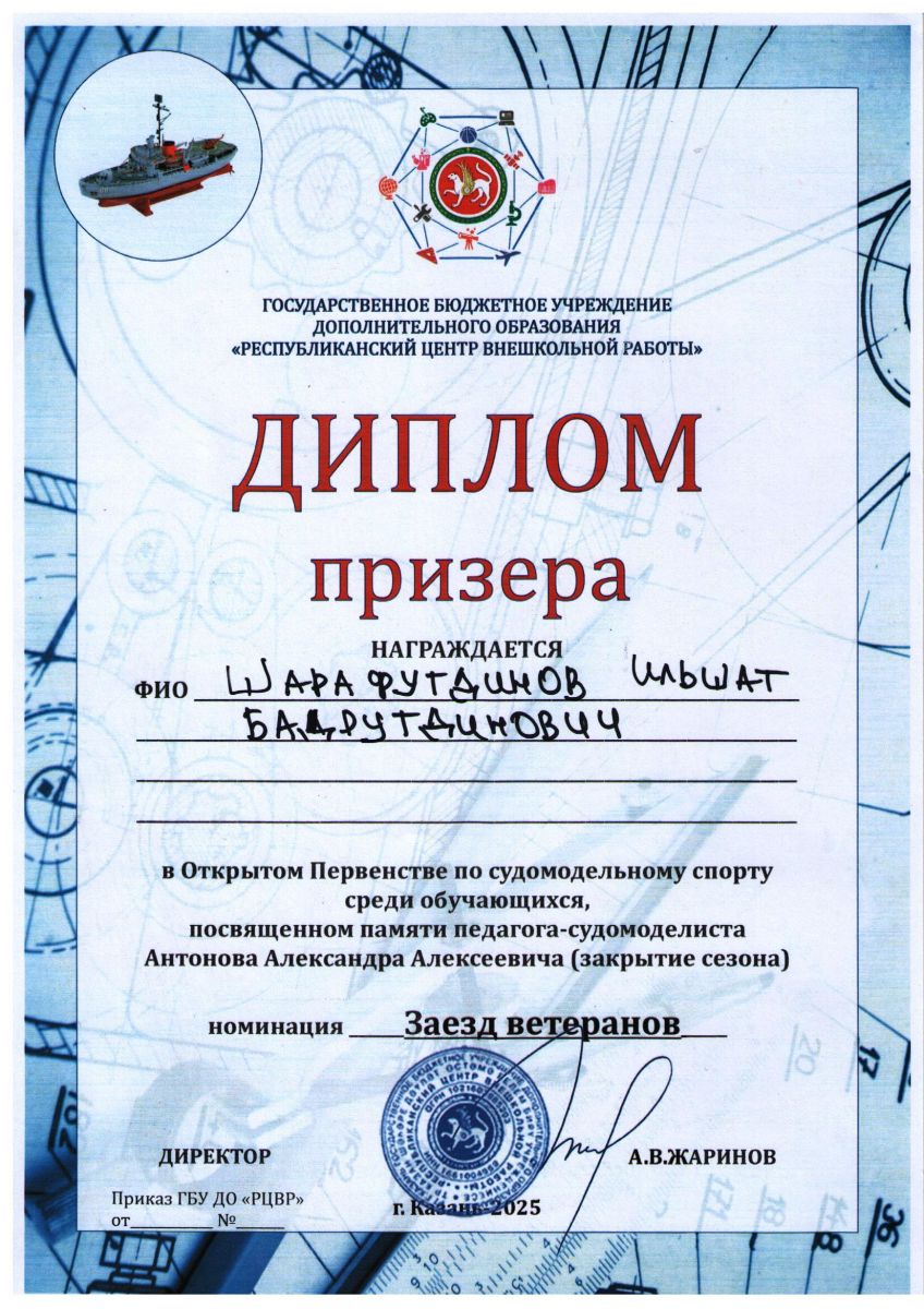 Поздравляем обучающихся педагога Шарафутдинова И.Б. с призовыми местами в Открытом первенстве по судомодельному спорту среди обучающихся, посвященном памяти педагога-судомоделиста Антонова А.А. (закрытие сезона)!