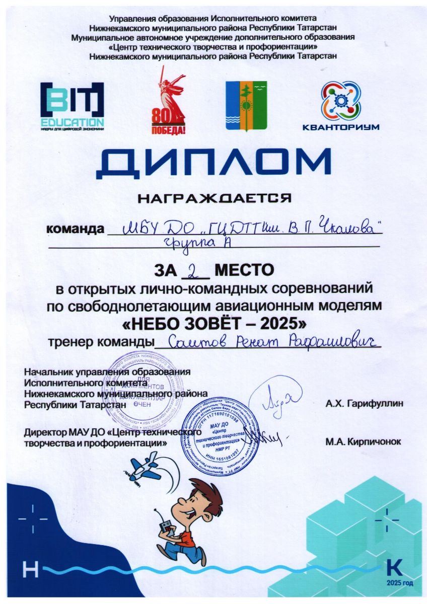 Опубликовано: 17.05.2025Поздравляем команду "Чкаловцы" (педагог Саитов Р.Р.) со 2 местом в командном зачёте на Соревнованиях по свободнолетающим авиационным моделям "Небо зовёт- 2025"!