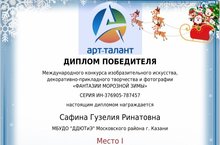 Поздравляем Сафину Гузелию победителя Международного конкурса изобразительного искусства, декоративно-прикладного творчества и фотографии "Фантизии морозной зимы"