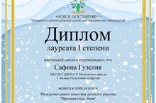 Поздравляем победителя Международного конкурса детского рисунка "Времена года. Зима" Сафину Гузелию и желаем новых достижений.