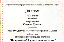 Поздравляем Сафину Гузелию, занявшую 1 место во Всероссийском конкурсе рисунков "Я - художник! В руках моих - краски!"