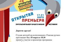 Студия детской мультипликации "Умелые ручки" приглашает всех принять участие в просмотре программы мультфильмов профессиональных студий мультипликации России XXVI Открытого российского фестиваля анимационного кино и зрительском голосовании. Вход свободный. Принимаются заявки от классных коллективов и групп д/с. Мероприятие пройдет в актовом зале "ЦВР" Московского района 18 марта в 18.30 по адресу Восстания 61А