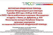 В рамках Международного дня инвалидов 4 декабря 2019 года с 10.00 до 13.00 часов в ГАУСО «Центр реабилитации инвалидов «Восхождение» по адресу: г. Казань, ул. Дубравная, д. 43 В Министерство юстиции Республики Татарстан организует мероприятие по оказанию БЕСПЛАТНОЙ ЮРИДИЧЕСКОЙ ПОМОЩИ.