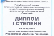 В республиканском конкурсе антинаркотических профилактических проектов среди образовательных организаций дополнительного образования детей "Парад идей" Ибрагимова Альбина Ренатовна заняла почетное Первое место! Поздравляем с успешным проектом, желаем новых идей и свершений!