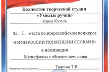 В Общественной палате РФ прошла церемония награждения участников Всеросссийского конкурса «Гимн России понятными словами». Цель конкурса: понимание символики Российской федерации как необходимое условие формирования патриотизма юных граждан страны. В конкурсе участвовали обучающиеся объединения «Умелые ручки», педагог Тюрина Татьяна Вениаминовна, и заняли 1 место в номинации «Мультфильм с объяснением слова». Наш мультфильм выполнен в технике «предметная анимация» о девочке Софии, которая узнала, что такое мудрость.