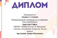 Поздравляем Аристову Софью с прекрасным результатом!На Международной олимпиаде по сольфеджио «Vivo Solfeggio» она завоевала звание Лауреата I степени. Это высокая награда за её труд, талант и отличные знания.Спасибо за профессионализм и вклад преподавателю — Арслановой Дание Наилевне!Желаем не останавливаться на достигнутом и новых творческих успехов! -