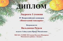 Поздравляем нашу талантливую ученицу Вильданову Разилю с блестящей победой на IV Всероссийском конкурсе «Новогодний мандарин» – она стала Лауреатом I степени!Отдельная благодарность преподавателю И.М. Гайнуллиной за профессионализм, мастерство и подготовку лауреата.Желаем новых и ярких побед! -