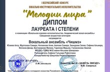 Поздравляем вокальный ансамбль «Чишмэ» с Лауреатом 1 степени на I Всероссийском конкурсе вокально-инструментального исполнительства «Мелодии мира»!Благодарственными письмами отмечены бессменный руководитель ансамбля Сафина Гульнара Рафгатовна и концертмейстер Шакулова Рената Сергеевна.