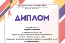 Всероссийский конкурс творческих работ патриотической направленности «Россия – Отчизна предков моих».Поздравляем Гарафиева Фархата с получением Лауреата 2 степени. В номинации вокальное исполнительство Фархат продемонстрировал не только техническое мастерство, но и глубокое понимание патриотической тематики.Благодарственное письмо было вручено преподавателю Сафиной Гульнаре Рафгатовне за достойный вклад в патриотическое воспитание подрастающего поколения.Гордимся! -
