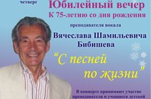 10 декабря а Актовом зале СОШ 130 состоялся Юбилейный концерт, посвященный 75-летию преподавателя вокала В. Ш. Бибишева. Вечер прошёл в тёплой и душевной атмосфере в кругу близких, друзей, коллег, выпускников, обучающихся и родителей. Звучала музыка зарубежных, русских и татарских композиторов.