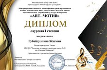 Поздравляем нашу ученицу Губайдуллину Жасмин с получением Лауреата 1 степени в Международной олимпиаде по сольфеджио среди обучающихся ДМШ, ДШИ и иных образовательных учреждений культуры и искусства «ART-мотив».Благодарим преподавателя Арсланову Данию Наилевну за прекрасную подготовку к олимпиаде!Желаем Вам дальнейшей продуктивной работы! -