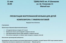 Дорогие коллеги! Приглашаем Вас на презентацию фортепианной музыки для детей композитора Гульнары Тимербулатовой. Будем рады Вас видеть 11 мая в 18.00 по адресу: Ш. Усманова , д. 11 Малый зал ТДМШ № 32.