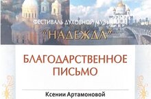 В мае в Александро-Невской Лавре (г. Санкт-Петербург) состоялся Гала-концерт Международного фестиваля духовной музыки «Надежда». В рамках фестиваля прозвучали произведения русских классиков, авторские обработки произведений татарских композиторов и народных мелодий для камерного оркестра. На Гала-концерте фестиваля в составе камерного оркестра «Renaissance» выступила преподаватель нашей школы Артамонова Ксения Михайловна. За активное участие в фестивале она была награждене Благодарственным письмом.