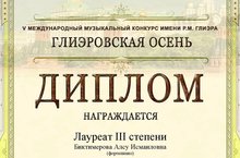 В Международном музыкальном конкурсе имени Р. М. Глиэра «Глиэровская осень» преподаватель нашей школы Биктимерова Алсу Исмаиловна успешно выступила в номинации "Фортепиано" и стала Лауреатом 3 степени.