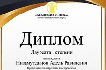 Преподаватель нашей школы Низамутдинов Адель Равилевич награжден Дипломом Лауреата 1 степени во Всероссийском дистанционном педагогическом конкурсе «Лучшая методическая разработка» по теме: «Инновационные технологии в обучении балалаечников и домристов: об игре под фонограмму».