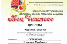 24-25 марта 2021 года в г.Набережные Челны прошел Открытый республиканский фестиваль-конкурс татарского искусства «Моң чишмәсе», в котором преподаватель нашей школы Радайкина Эльвира Рауфовна стала Лауреатом 1 степени в номинации «Струнно-смычковые инструменты», а также приняла участие в работе площадки обмена педагогическим опытом «Педагогическая мастерская» с методическими рекомендациями «Татарская музыка в репертуаре обучающихся младших классов по специальности «Скрипка» в детской музыкальной школе» (из опыта работы). Методические рекомендации были опубликованы в сборнике материалов площадки обмена опытом «Педагогическая мастерская».