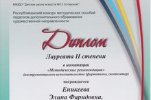 1 апреля 2021 года в г. Набережные Челны прошел Республиканский конкурс методических пособий педагогов дополнительного образования художественной направленности, в котором преподаватель нашей школы Еникеева Элина Фаридовна стала Лауреатом 2 степени в номинации «Методические рекомендации» (инструментальное исполнительство (фортепиано, синтезатор).