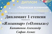 В марте 2021 года в Тюмени прошел Международный многожанровый конкурс талантов для детей и взрослых «Творческая вселенная», в котором ансамбль «Ялкыннар» («Огоньки»): Капитонов Александр, Сафин Алмаз, рук. Марданова Галия Фазлтдиновна, стал Дипломантом 1 степени.
