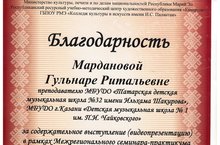 Преподаватель Марданова Гульнара Ритальевна приняла участие в Межрегиональном семинаре-практикуме для преподавателей струнных инструментов и концертмейстеров ДШИ и ДМШ с выступлением (видеопрезентация) на тему «Способы выявления и поддержки творческих способностей учащегося в процессе обучения», которой состоялся 24 марта 2021 года в Колледже культуры и искусств имени И.С.Палантая Республики Марий Эл.
