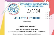 В феврале 2021 года состоялся I Всероссийский конкурс-фестиваль «В ритме сердца и души», в котором преподаватель нашей школы Радайкина Эльвира Рауфовна стала Лауреатом 1 степени в номинации «Струнные инструменты. Скрипка»