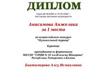 7 мая 2020 г. учащаяся «ТДМШ № 32 им. И.Шакирова» Анисимова Анжелика (преподаватель Биктимерова А.И.) приняла участие в дистанционном Всероссийском конкурсе «Музыкальный турнир», где она заняла 1 место.