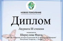 Учащаяся 1 класса ТДМШ №32 Шеркулова Фаиза (преп. Биктимерова А.И.) в мае 2020 г. приняла участие в Международном конкурсе детского творчества «Мир вокруг нас. Домашние животные» в номинации «Декоративно-прикладное творчество», где стала Лауреатом III степени.