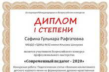 Сафина Гульнара Рафгатовна награждена Дипломом 1 степени за конкурсную работу: "Влияние коллективного детского хорового пения на формирование духовно-нравственных качеств личности". Низамутдинов Адель Равилевич награжден Дипломом 2 степени за конкурсную работу: "Инновационные технологии в обучении балалаечников и домристов (об игре под фонограмму)".