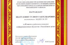 Воспитатель группы № 5 Ибатуллина Гулюза Габтелбаровна приняла участие в районном конкурсе информационных буклетов "Экология и дети" и заняла 2 место. коллектив детского сада поздравляет ее и желает дальнейших творческих успехов.