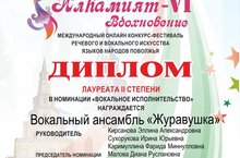 Вокальный ансамбль "Журавушка" занял 2 место в международном онлайн конкурсе- фестивале речевого и вокального искусства языков народов Поволжья. В состав вокального ансамбля вошли воспитанники детского сада. Руководитель ансамбля Каримуллина Ф. М.