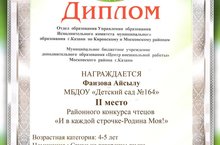 Поздравляем Фаизову Айсылу воспитанницу старшей группы с победой в районном конкурсе чтецов "И в каждой строчке- Родина моя!", номинация : стихи на татарском языке. Айсылу награждена дипломом 2 степени. Педагоги: Гилазетдинова Р. К., Зиннатуллина Л. И.
