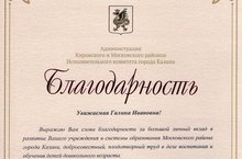 Администрация Кировского и Московского районов Исполнительного комитета города Казани выражает слова благодарности Галине Ивановне за большой личный вклад в развитие детского сада № 164 и системы образования Московского района!