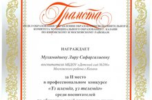 Поздравляем Мухамадиеву Л.С. воспитателя по татарскому языку, которая приняла участие в профессиональном конкурсе "Уз илемдэ, уз телемдэ" и была награждена грамотой за II место. Желаем дальнейших успехов и новых побед!