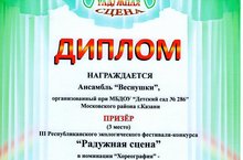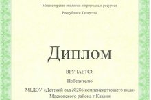 За участие в акции "100 зеленых уголков образовательных учреждений Татарстана" МБДОУ № 286 как победитель получил диплом Министерства экологии и природных ресурсов Республики Татарстан.