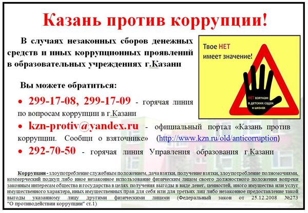 В соответствии с п. 1 ст. 1 Федерального закона от 25.12.2008 № 273 - ФЗ "О противодействии коррупции" под коррупцией понимается злоупотребление служебным положением, дача взятки, получение взятки, злоупотребление полномочиями, коммерческий подкуп. Кодекс РФ об административных правонарушениях предусматривает административную ответственность за незаконное вознаграждение от имени или в интересах юридического лица (ст. 19.28 КоАП РФ). Сообщайте о фактах коррупции! На официальном сайте прокуратуры РТ: http://prokrt.ru, на странице "Противодействие коррупции". В разделе "Комиссия по противодействию коррупции" и в разделе "Информация для родителей" размещена вся информация.
