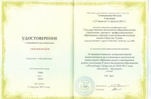 Наш воспитатель прошла курсы повышения квалификации в "Арском педагогическом колледже имени Габдуллы Тукая" по дополнительной профессиональной программе "Совершенствование коммуникативной компетентности русскоязычного воспитателя дошкольного образовательного учреждения в рамках реализации Стратегии развития образования в Республике Татарстан на 2010-2015 годы "Килэчэк"-"Будущее" в объеме 144 часа.