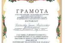 Поздравляем нашего воспитателя Фатихову Гулию Марселевну, участницу районного конкурса «Лучший воспитатель дошкольного образовательного учреждения - 2017», победителя в номинации «Педагогическая надежда»!