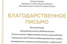 Администрация Кировского и Московского районов Исполнительного комитета города Казани наградил коллектив детского сада Благодарственным письмом за высокую результативность в профессиональных конкурсах, активную, плодотворную работу и большой вклад в развитие системы дошкольного образования Кировского и Московского районов города Казани