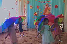 В гости к ребятам пришли помощники Осени: Листочек и Капелька, и принесли с собой волшебные, осенние шарики. Ребятам пришлось выполнить всё задания Осени и сделали это с большим удовольствием: рассказали о приметах осени, поиграли в игры - эстафеты "Посади и собери урожай", "Пробежаться с зонтиком», отгадывали осенние загадки, пели песни, читали стихи, станцевали весёлые танцы "Танец с зонтиком", "Осенний парный танец".