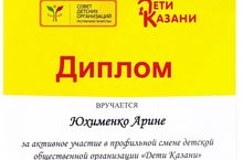 Поздравляем Юхименко Арину, учащуюся 9к класса, которая получила Диплом за активное участие в профильной смене для лидеров и активистов детских общественных объединений г. Казани «Дети Казани», проходившей с 19 по 22 марта 2018 года на базе ГАУ «Молодежный центр «Волга»