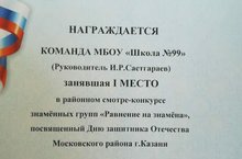 Поздравляем команду школы 99 с I местом в районном смотре-конкурсе знаменных групп "Равнение на знамена". Выражаем благодарность педагогу Саетгараеву Игорю Равилевичу за подготовку команды!