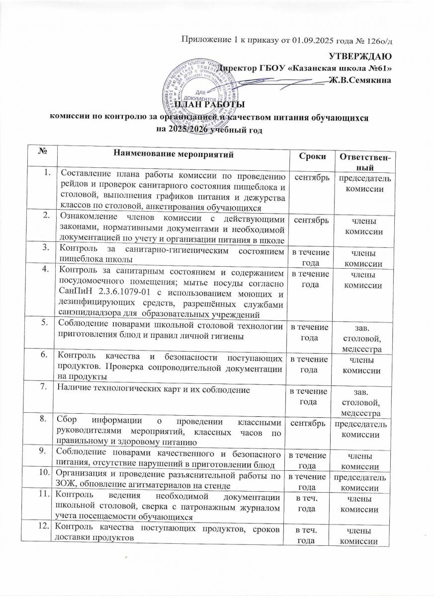 План-график работы комиссии по контролю качества питания обучающихся на 2025/2026 учебный год