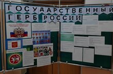 На стенде представлены фотографии герба, история его создания и интересные факты, а также небольшой тест, который может пройти любой желающий. Внимание привлекают яркие фотографии герба, где отчетливо виден двухглавый золотой орел, а так же герб Республики Татарстан.