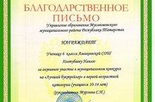 6 класс укучысы Холбутаева Н. районда уздырылган "Лучший буктрейлер" конкурсында катнашты. Фоат Садриевның "Таң җиле" китабы буенча эше өчен рәхмәт хаты белән бүләкләнде. Җитәкчесе- Мурзина С.Н. Котлыйбыз һәм уңышлар телибез!