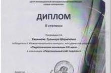 Татар теле һәм әдәбияты укытучысы Хәкимова Г. " 21 нче гасыр педагогик инновацияләр" дигән Икенче регионара методик эшкәртмәләр конкурсында " Педагогның шәхси сайты" номинациясендә 2 дәрәҗә дипломга ия булды.
