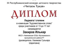 9 нчы сыйныф укучысы Закиров Илнар "Тукайны укыйбыз" III республикакүләм конкурсында катнашып, "Сәнгатьле сүз" номинациясендә I дәрәҗә лауреат дипломына лаек булды. Җитәкчесе Хәкимова Гөлнара Шәриповна. Котлыйбыз!